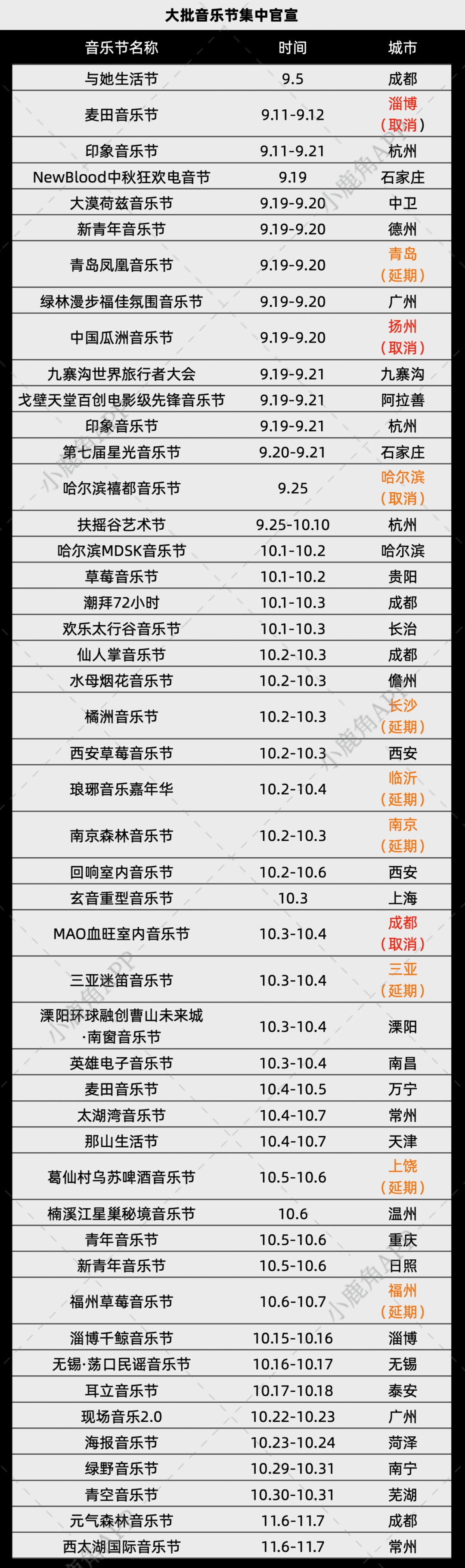 另一方面,主办方也再次无奈宣布音乐节的延期或者取消。截至目前为止,已经有11个音乐节发出了延期或取消的通告,更有行业从业者表示,未来一段时间内还会陆续有音乐节延期或取消。