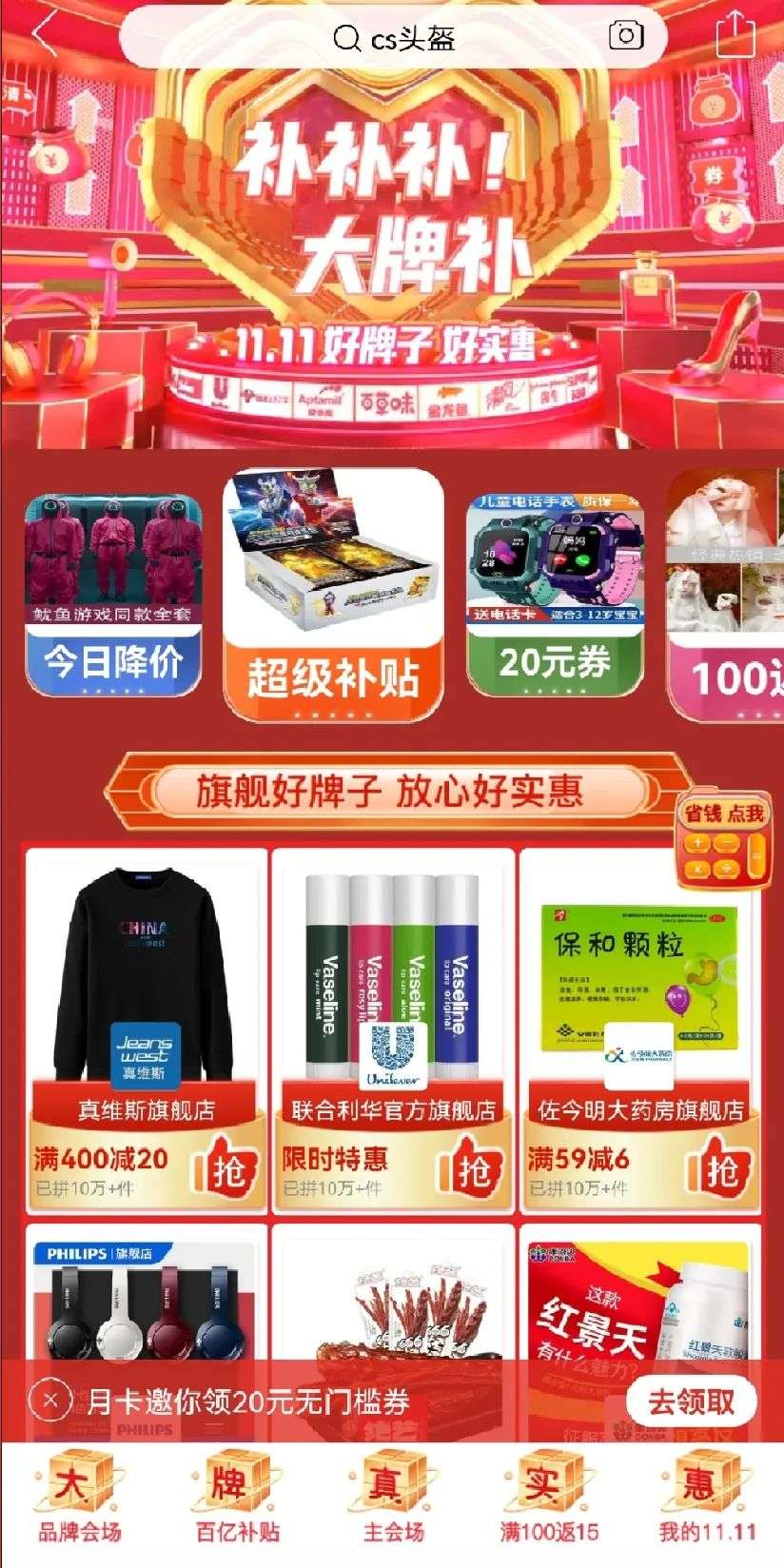 原本在双11略显低调的拼多多,今年反而一改姿态变得十分积极。去年“双节棍”最火热的时候,拼多多的双11活动依然只有5天,但今年,拼多多从20日加入了战局,打出了“11.11大促”的底牌。打开主会场可以发现,以爆款单品“货找人”逻辑起家的拼多多,在双11的主会场,却把旗舰店放在了最前面,标上了“旗舰好牌子,放心好实惠”的口号,单品反而排在了之后——这更像是一种对品牌方的示好,以此来拉近和品牌之间暧昧的关系。