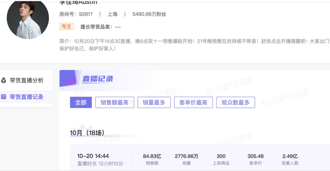 在预售开始前的一周,薇娅和李佳琦直播间的销售额都有了断层式的下滑——原本每晚带货金额动辄上亿的主播们,都选择了不带货,专心种草,10月19日的直播,薇娅销售额只有1万元(数据来源:小葫芦直播平台数据)。