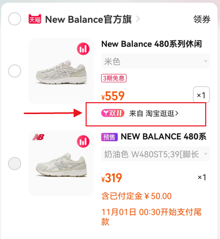 而就在预售开启前夕,手淘进行了一次改版。淘宝直播在原有金刚位入口,增加了直播tab入口,与首页的“订阅”、“推荐”相并列,相当于在内容场、经营场之外增加一个直播场。与此同时,消费者通过观看逛逛内容加入购物车的商品,还会有一个单独的“来自淘宝逛逛”标签,进一步加强了消费者种草的心智。