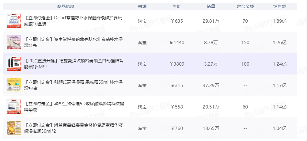 丰富的商品,优惠的价格,带来了集中性的流量。在8点预售正式开始前的直播讲解期,李佳琦和薇娅已经分别上线252个链接、342个链接。每一款链接对应一款促销商品,也对应一个真香的价格。当晚,薇娅销量最高的一款商品依然是Whoo天气丹礼盒,超过34万的销量为其带来了5.56亿的销售额;李佳琦则依靠姑娘们都熟悉的药丸面膜“蒂佳婷”拿到了1.88亿的成交(数据均截至00:30)。