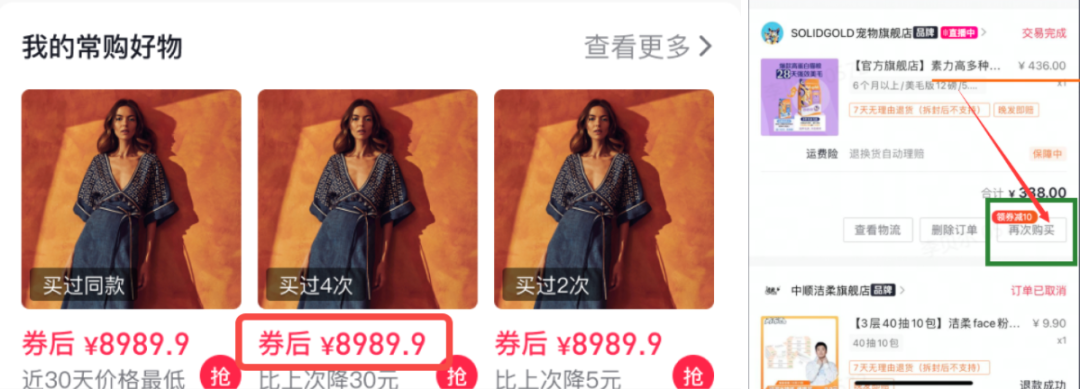 另外,抖音电商除了加强商家的私域运营外,还内测了“复购券”和“我的常购好物”功能。“我的常购好物”功能,可以帮助顾客随时查看以往买过的商品降价动态,而“复购券”则是在订单完成页中出现,两者都是针对已购买过的店铺顾客人群推出的定向权益,用以提高会员二次复购转化,以及提高会员客单。