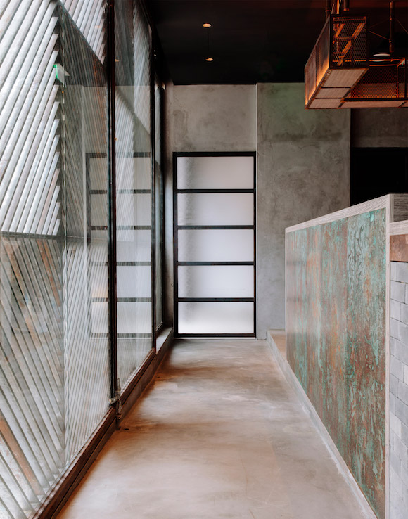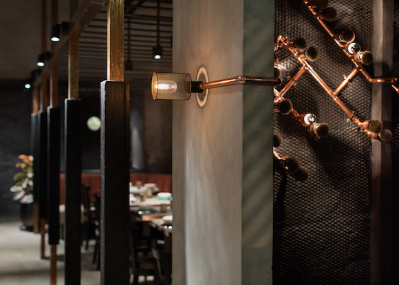 这次的设计可以分为三部分来看。首先,最显而易见的是,在餐厅整体内饰风格上,“焦”是最大特点。从餐厅的内外立面到吧台、隔断、餐桌,不论是由松木还是金属材料做成的,都会经过火焰熏烤,并以醋酸溶液浸泡,从而做出工业风的斑驳视觉。留心看会发现,餐桌上摆着的茶杯也有差不多的熏烤图纹。