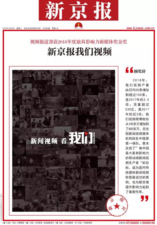 新京报“我们视频”项目,在过去的一年里,日均产量超过100条,流量超过530亿,粉丝增加到600多万,再次获得2018年度最具影响力新媒体金奖。