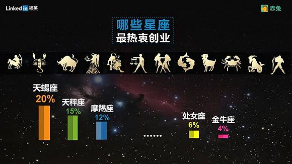 尤为引人瞩目的是,领英此次特别推出了关于星座和创业者的关系。天蝎座、天秤座和摩羯座成为了最热衷创业星座的前三名。在领英和赤兔的数据库中,高达20%的创业者来自天蝎座。天蝎座有着优秀的创业基因,成功的案例也颇为令人信服。在BAT中,马化腾和李彦宏都是天蝎座。天蝎座强大的目标认知和极强的占有欲,不达目的誓不罢休的性格,都造就了其成为老板的最佳潜质。另一方面,在最热衷创业的星座中,金牛座以4%的比例垫底榜单。或许这与金牛座偏好稳定,不爱变动、慢热的性格有着一定的关系。