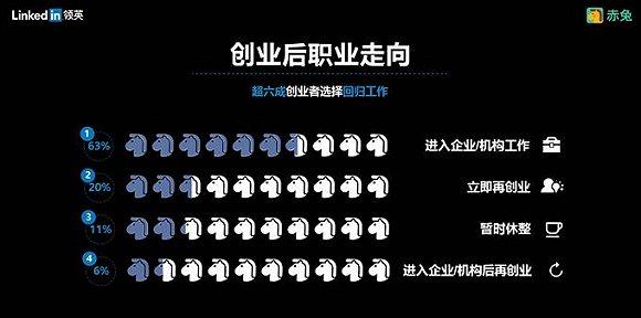 尽管创业的远景美好,但现实依然是骨感的。从总体比例看,创业成功的几率可能连1%都不到,人们看到的往往是那些光鲜的成功案例,但其实绝大多数的创业者却不得不接受失败。领英发现63%的创业者选择回到企业或政府机构重新开始工作,而20%的创业者非常执着,选择立即投入再次创业,而11%的失意者表示休整后再看。