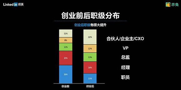 尽管遭受了创业失败的打击,但创业还是会为职场人带来宝贵的经验和收获。在创业前后的职级对比中,创业者在经历了创业的洗礼之后,职级有了很大的提升。企业高管中,包括合伙人,企业CXO的比例,由创业前的11%增长到创业后的22%。这个数据进一步验证了一个职场发展上的真理,即:创业没有失败者,只要认真坚持走一段创业的路,无论成功与否,人生的经验都将获得极大的积累,这也为下一段旅程奠定了坚实的基础。