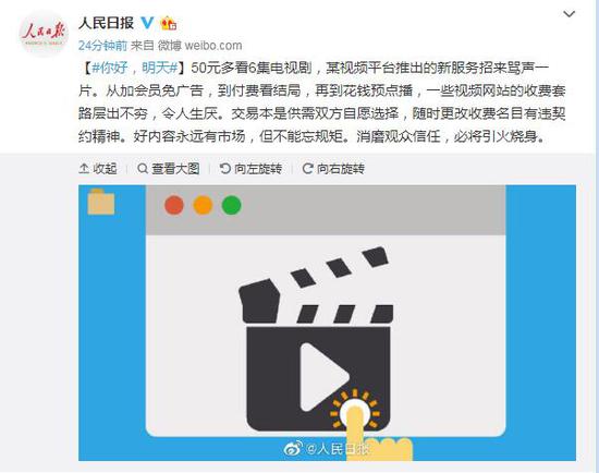 50元多看6集电视剧,某视频平台推出的新服务招来骂声一片。从加会员免广告,到付费看结局,再到花钱预点播,一些视频网站的收费套路层出不穷,令人生厌。交易本是供需双方自愿选择,随时更改收费名目有违契约精神。好内容永远有市场,但不能忘规矩。消磨观众信任,必将引火烧身。