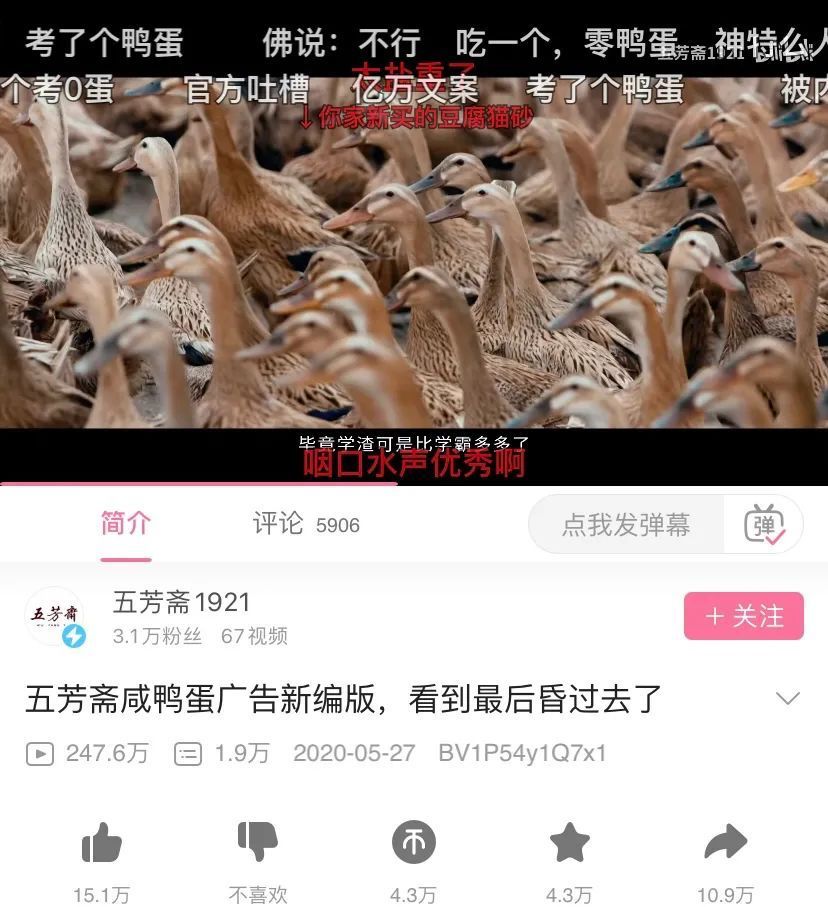 今年刚满一百周岁的五芳斋,就在B站十分活跃。2020年5月,五芳斋在B站发布咸鸭蛋创意广告,像纪录片一样展现原产地的画面,配上的却是“听奶奶的话,吃两个咸鸭蛋,然后走进考场,神挡杀神,佛挡杀佛”等魔性的台词。
