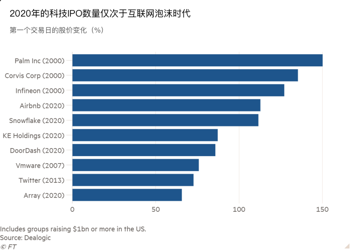 尽管这一年充满不确定性,但在2020年仍有65家科技公司上市,不免让人想起当年的互联网泡沫时期,心有戚戚。云计算公司Snowflake和外卖配送应用DoorDash的表现都不俗,而Airbnb的成就更加耀眼。Airbnb的股价在12月上市的交易首日便翻了一倍。