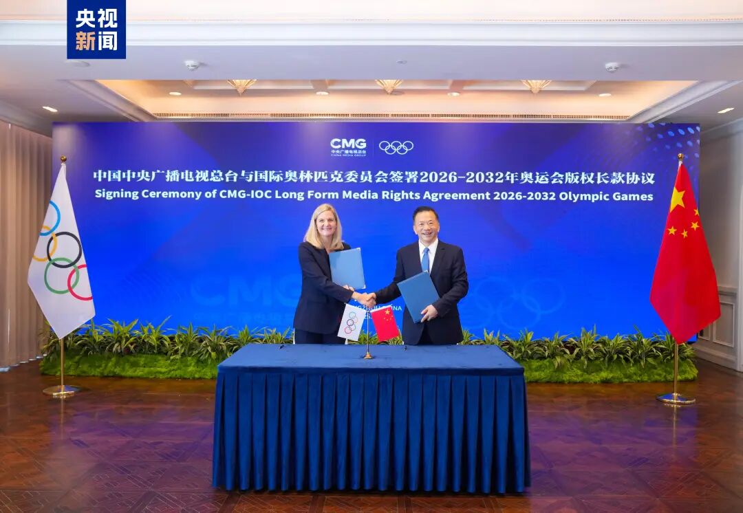 在中华人民共和国第十五届运动会开幕之际,11月9日,中央广播电视总台与国际奥委会在广州签署2026—2032年奥运会版权长款协议。中宣部副部长、中央广播电视总台台长慎海雄和国际奥委会主席考文垂代表双方签约,并共同发布总台2026年米兰-科尔蒂纳丹佩佐冬奥会报道标识。国际奥委会终身名誉主席巴赫出席活动。
