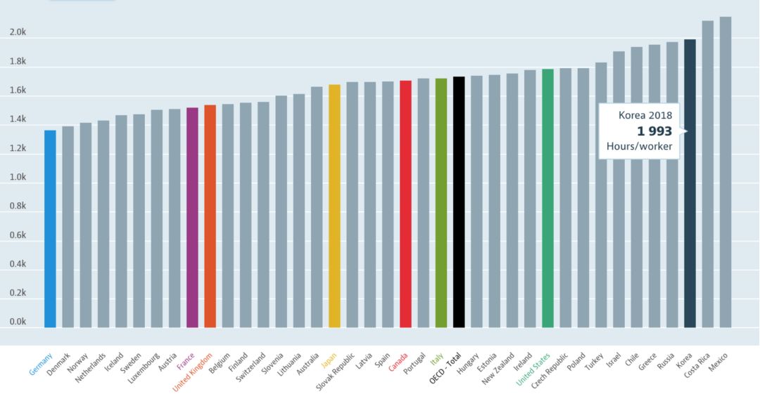我们不妨去看看OECD的全球各国劳动者的年工作时长对比。OECD(经济合作与发展组织)常年有一项“Hours worked”(工作时长)调查,记录了36个市场经济国家的社会经济发展状况。