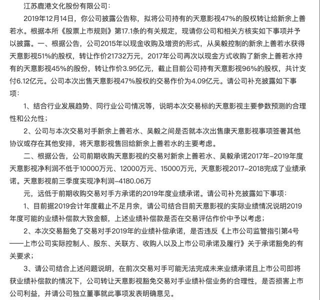 与此同时,鹿港文化出让天意影视的股份。在11月13日的股权转让完成后,鹿港文化持有天意影视的股权比例由96%下降至49%,天意影视不再为鹿港文化控股子公司,不再纳入公司财务报表合并范围。公告还明确指出,公司将持有的天意影视47%的股权转让给新余上善若水后,在短期内收到一笔股权转让款,可以将更多的资金用于主业发展,为下一年的纺织主业稳步发展提供资金支持。