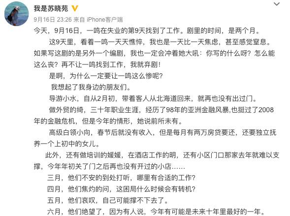 苏晓苑是试图向观众解释过的。早在该剧播出到陈一鸣失业片段时,就曾引发网友争议,面对此她以身边各行各业失业、或是艰难挣扎的人为现实模板,解读了人物的现实性,并表示“我们不是爽剧,我们所有主创的初衷不是要让你忘了生活的苦。这一次我们想说的是:我知道,今天又是很辛苦很不如意的一天”。