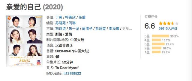 《亲爱的自己》的豆瓣评分也印证了这一点。该剧豆瓣开分成绩7.3分,在今年现实题材开分8分频出的大环境下并不算优秀,同时随着剧情推进,豆瓣评分下降至6.6分。不过,从评分分布来看四星和五星人数占比46%,一星和二星占比31%,换言之观众对该剧的评价褒贬不一,喜欢和差评背后都有庞大的人群。