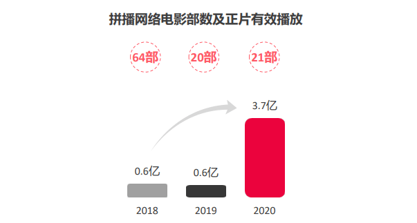 比如2020年由奇树有鱼、项氏兄弟联合出品的《奇门遁甲》在腾讯视频、爱奇艺双平台上线;影纳文化、淘梦影业出品的《龙虎山张天师》则首次通过腾爱优三平台联合发行;此外,系列电影《陈翔六点半之民间高手》在爱奇艺、优酷以单片付费模式上线,再次开拓了多平台拼播发行模式。据《2020中国网络电影行业年度报告》显示,2020年拼播网络电影数量为21部,正片有效播放超过3.7亿,相比2019年的0.6亿有了显著提升,而拼播影片的累计正片有效播放占有率也提升至4.8%。