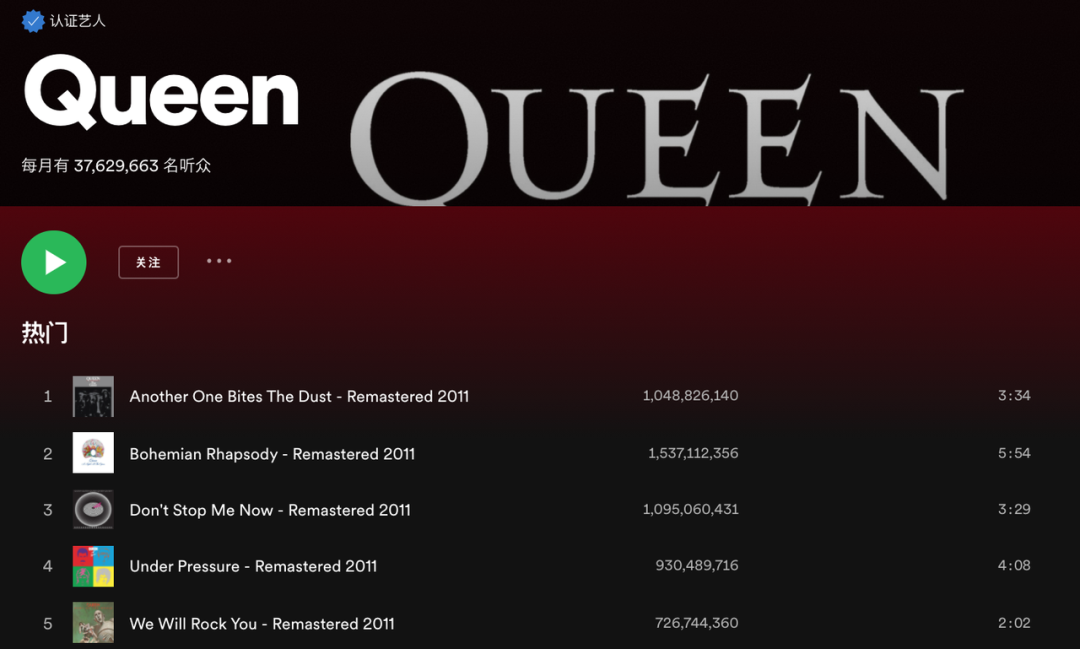 如今,皇后乐队仍然是Spotify上排名第38位的艺人,在该平台每月吸引超过3760万听众。这一数据超过了Kanye West的3580万、Beyoncé的3260万、The Beatles的2430万和Jay-Z的2160万。