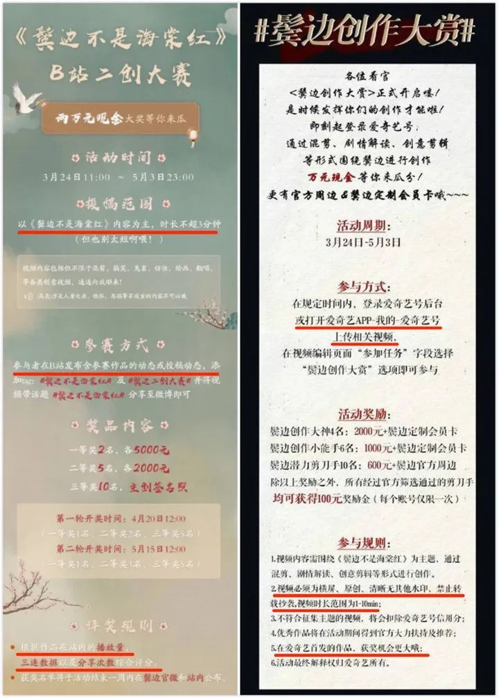 这是3月25日爱奇艺号发起的“鬓边创作大赏”活动,旨在鼓励剪刀手发挥各自的才能,创作更多同人作品,是一种官方借助粉丝力量宣传的手段。剪刀手作为粉丝追剧,本身有产出积极性,官方能收获高质量的安利视频,原本是一件双赢的事。