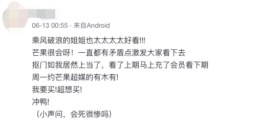 有网友评论称,因为《乘风破浪的姐姐》,芒果的会员必须冲一波。从这套综艺节目的舆情热度、播放量、豆瓣上的评分指数等指标,都说明了芒果极有可能依靠这个节目打上一波漂亮的翻身仗。