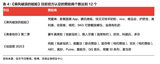 据西部证券数据显示,目前该节目官方认定的赞助商个数达到已达到12个,超过同期同类型综艺《青春有你2》(5个)以及《创造营2020》(11个),广告主对节目认可度高。