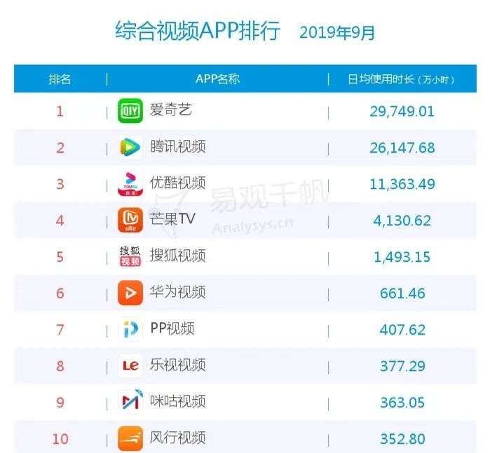 根据易观千帆的数据显示,2019年9月国内综合视频App排行,日均使用时长上,爱奇艺和腾讯视频分居第一和第二位。