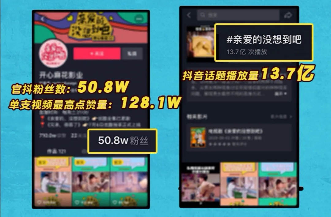 相反,在抖音平台,话题播放量竟然高达13.7亿,官抖粉丝数直接飙升至50.8万,单条视频最高点赞量达128.1万,剧集内容在抖音上被多个剪辑号进行二次创作。