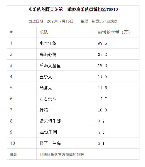 排在第一的是1995年成立的野孩子,排在末位的Mandarin可能很多人压根都没听说过,因为他们刚成立没多久。