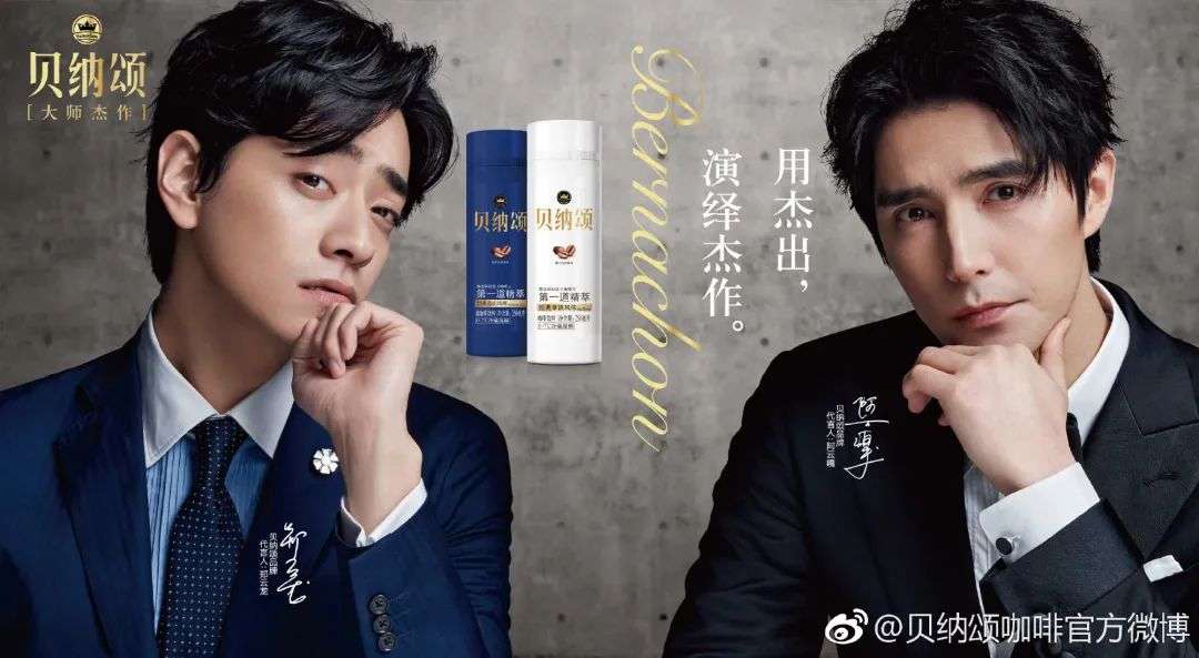 以同出演《声入人心》的阿云嘎和郑云龙为例,他们的组合被粉丝称为“云次方”。2019年4月,贝纳颂咖啡邀请二人共同成为代言人,并为他们拍摄了一支广告片。短片中,阿云嘎和郑云龙共同对“什么是大师”进行探讨和对话,最后引出贝纳颂咖啡的广告卖点——专业、有品味。