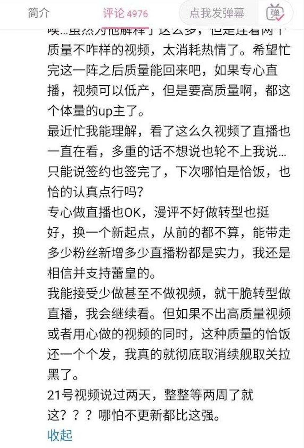 此外,很多UP主成为综艺嘉宾,由此导致创作精力分散,也会引起部分老粉丝反感,认为其如今的视频创作质量下降,是因为UP主将重心放在了综艺上,“抱团搞低创”等相关质疑声音在B站上也开始不断出现。