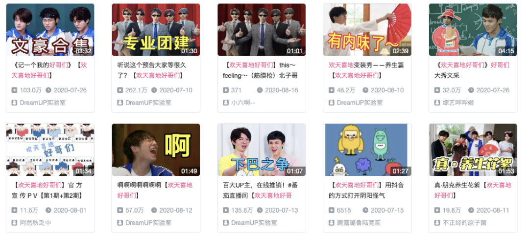 B站自制的综艺,也带有典型的B站文化。以《欢天喜地好哥们》为例,目前节目播放3期,拥有近5000万的播放量,142万弹幕,在节目高潮部分,会有不少用户疯狂刷屏,用户利用弹幕形式表达感受,甚至还会直接与UP主、艺人进行隔空互动,弹幕文化体现明显。
