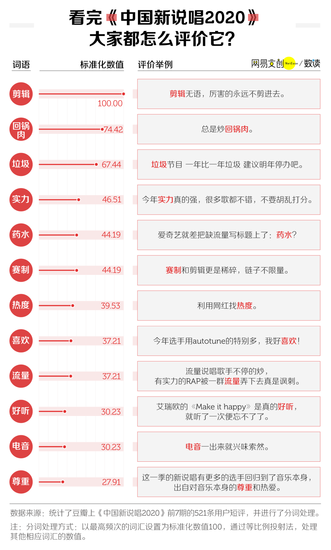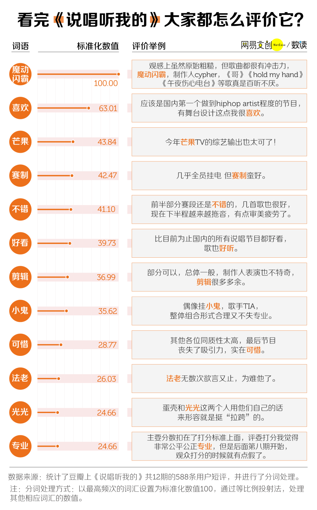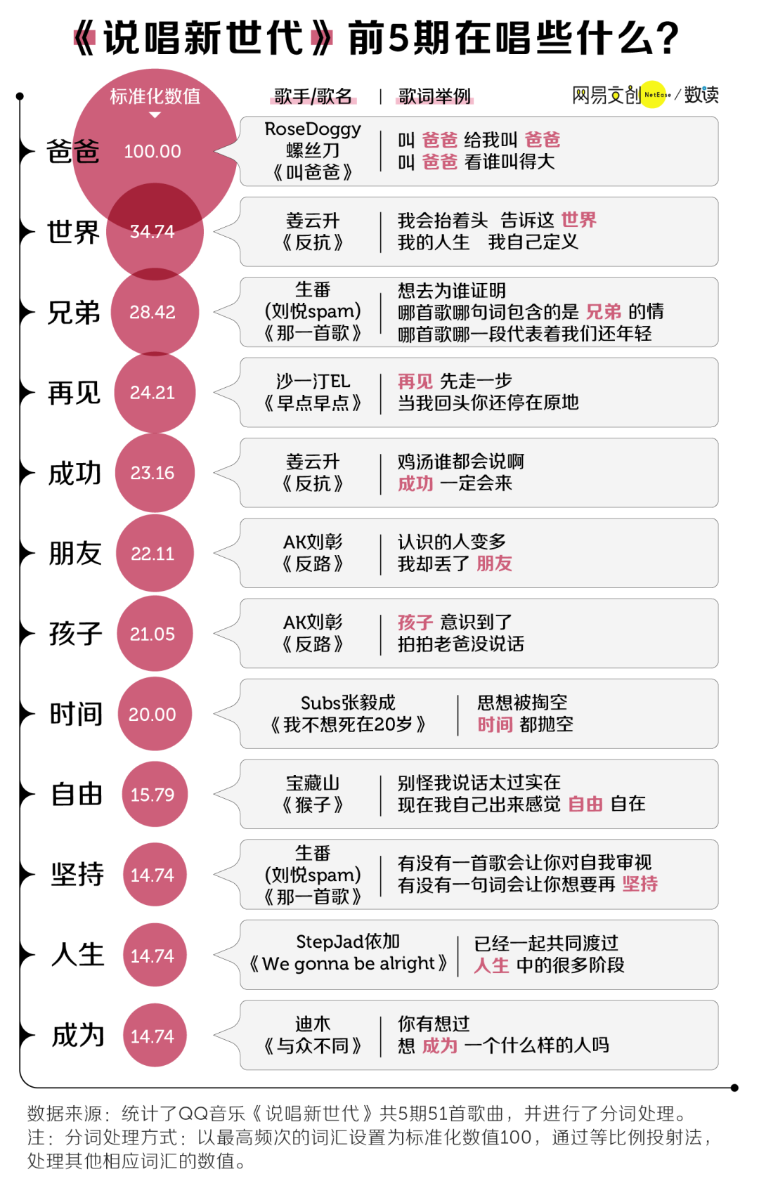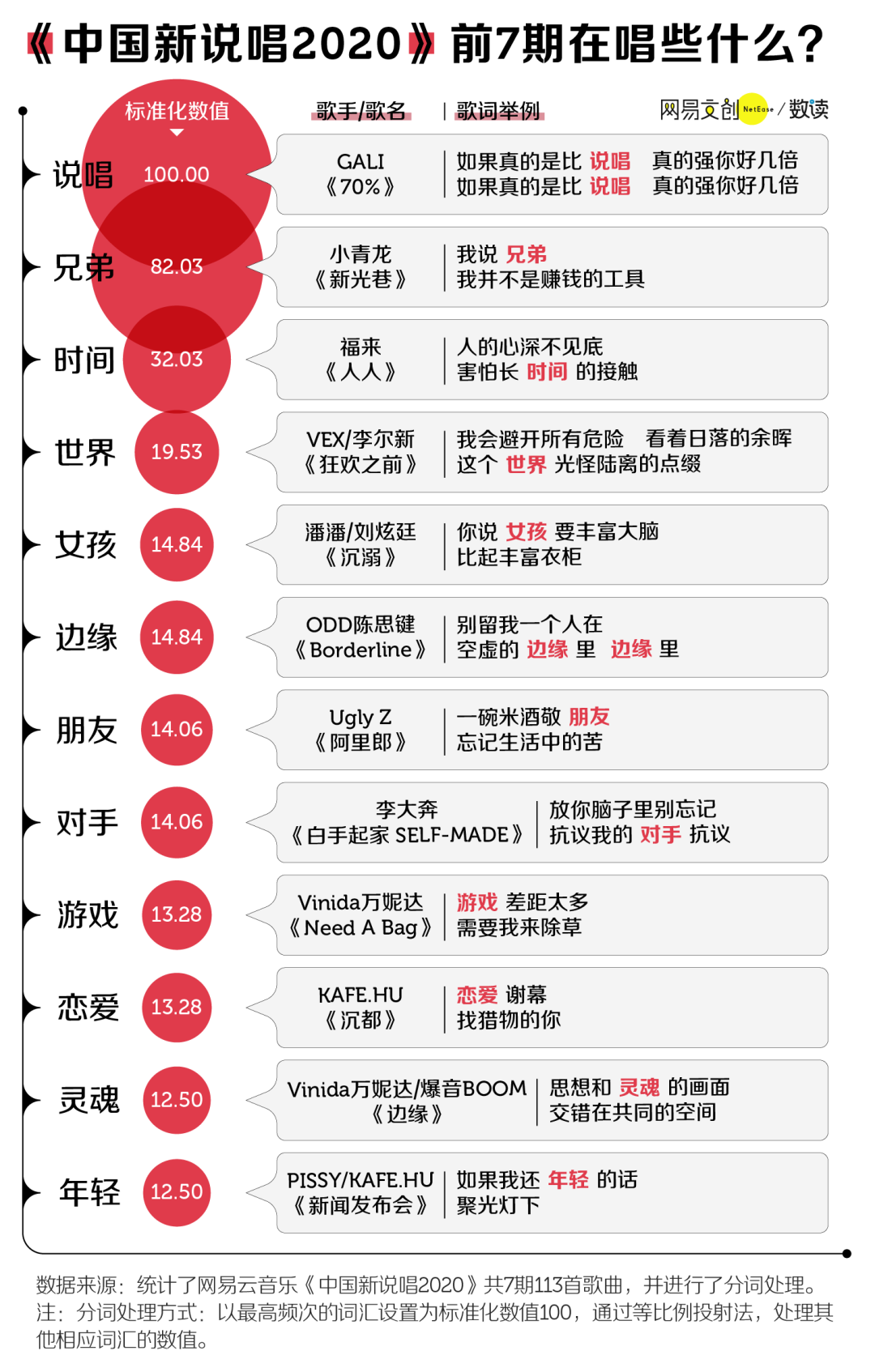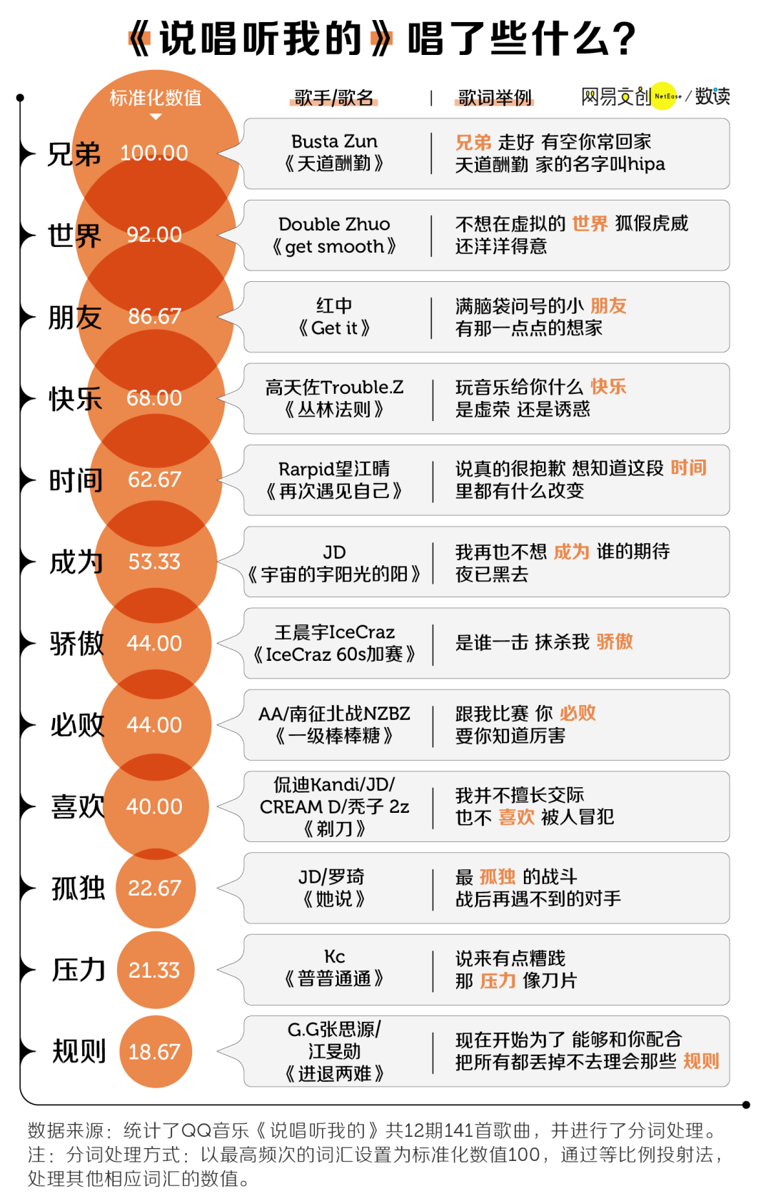 如果撇开热度,看音乐类节目的核心,即作品,三档节目又不太相同。之前数读菌在分析中国说唱作品的歌词时就提到过,说唱作为一种音乐形式是 Rapper 表达自我的方式,而词是说唱中的灵魂。