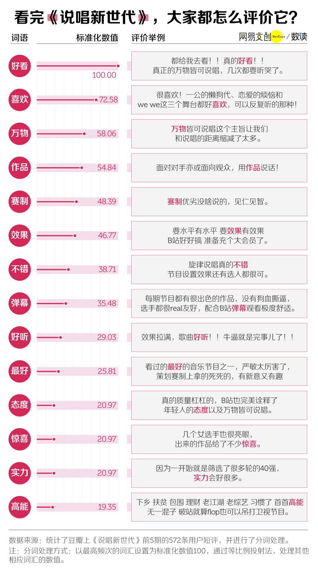 评价中的“万物”一词热度指数为 58.06,仅次于“好看”“喜欢”,排在第三位。《说唱新世代》在播出时,就打出“万物皆可说唱”为主旨。