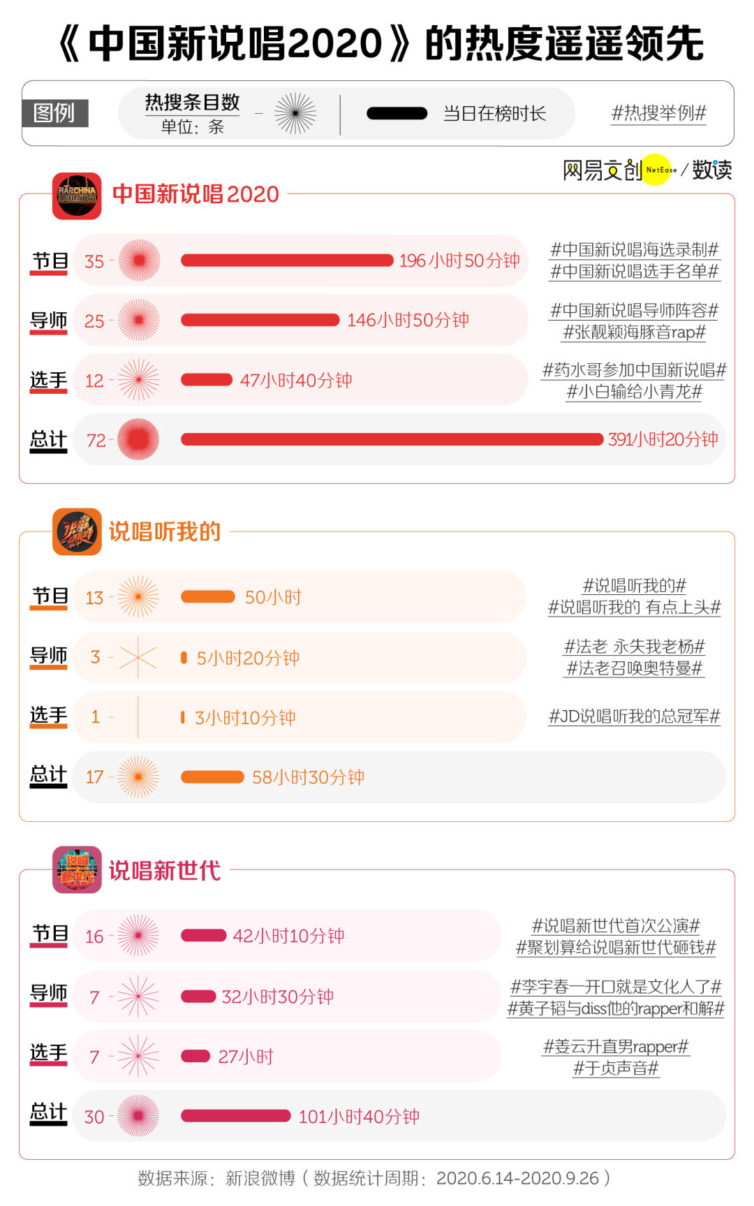 数读菌统计了三档节目上微博热搜的条目数和热搜在榜时长,《中国新说唱 2020》以绝对的优势胜出。自开播以来,《中国新说唱 2020》共计 72 条热搜,总在榜时长为 391 小时 20 分钟。