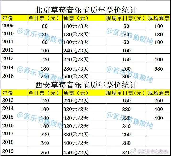 以2009年创办的草莓音乐节为例。从一开始的单日票价80元到今年最低票价300元,总共涨了5倍。总体来看,单日票价基本上是按照每年20元递增的,除了2014年票价增加了60元。而2014年也是音乐节票价普遍猛增的一年,那一年张曼玉出现在草莓音乐节的舞台,简单生活节从台北来到上海,蔡依林、张惠妹这类流行歌手的到来,将音乐节从小众带向大众。