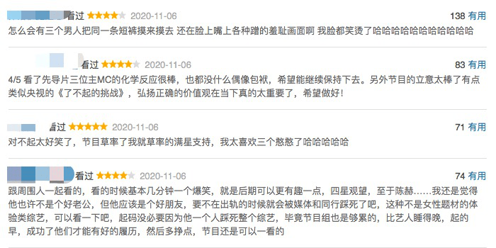 “爆笑如雷,想说找熟人录制节目就是不一样,气氛不会让人觉得尴尬,而且化学反应强能快速接梗”、“感觉这种综艺大家还是像这样彼此之间熟才有趣,玩起来放的开,也省去了不熟的人之间没话找话的尬聊”……