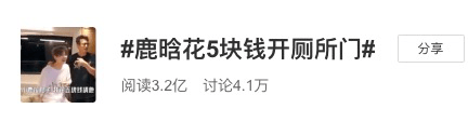 虽然当下户外真人秀难逃瓶颈、各种新概念综艺不断涌现,但《哈哈哈哈哈》(以下简称《五哈》)仍然在上线之初便向市场展现了它的“话语权”: 微博上#鹿晗 花5块钱开厕所门#阅读量突破3.2亿,#鹿晗用裤衩擦脸擦嘴#阅读量达到2.7亿;抖音等短视频平台上,#鹿晗 砍价高手#等名场面也在不断传播。