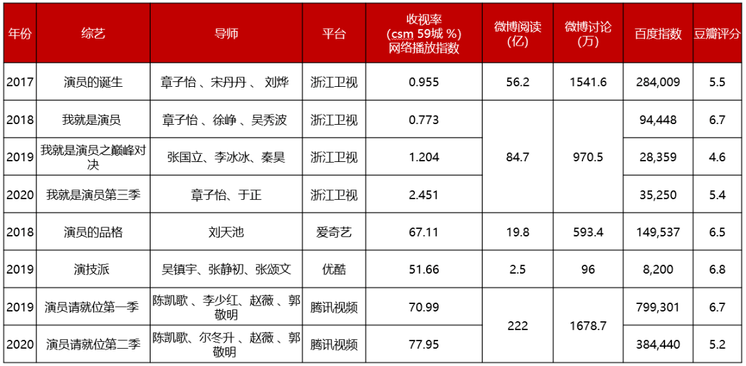 回首2017年,随着大众审美能力的逐渐提高,对烂演技的容忍力度越来越低,《演员的诞生》应运而生,让一些并不被观众所熟知的二、三线优秀演员大放异彩,犹如一股春风,在行业中吹起了波澜。一时间人人都以为“好演员的春天到了”,没想到四年过去了,演技类综艺扎堆上线,有话题、有热搜、有偶像入局、有导师撕逼,唯独“演技”越来越无人在意。今天,就让我们通过数据来回顾演技类综艺一路走来的“得”与“失”。