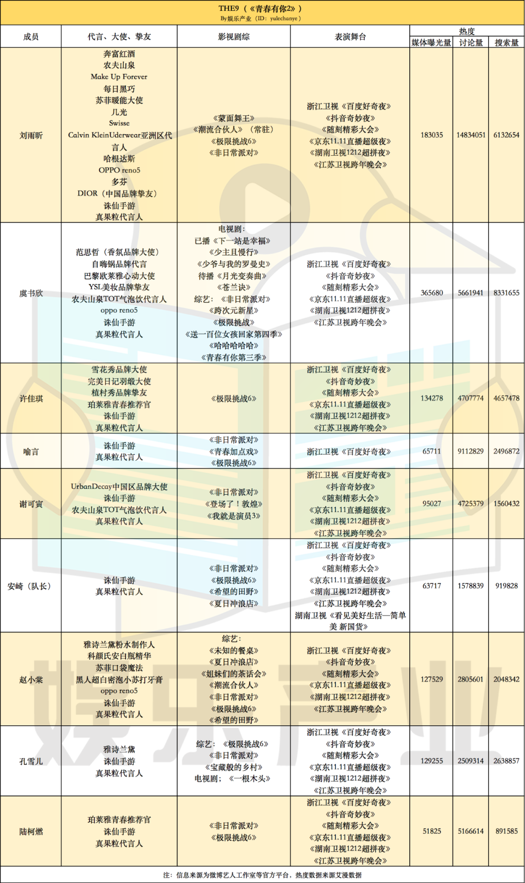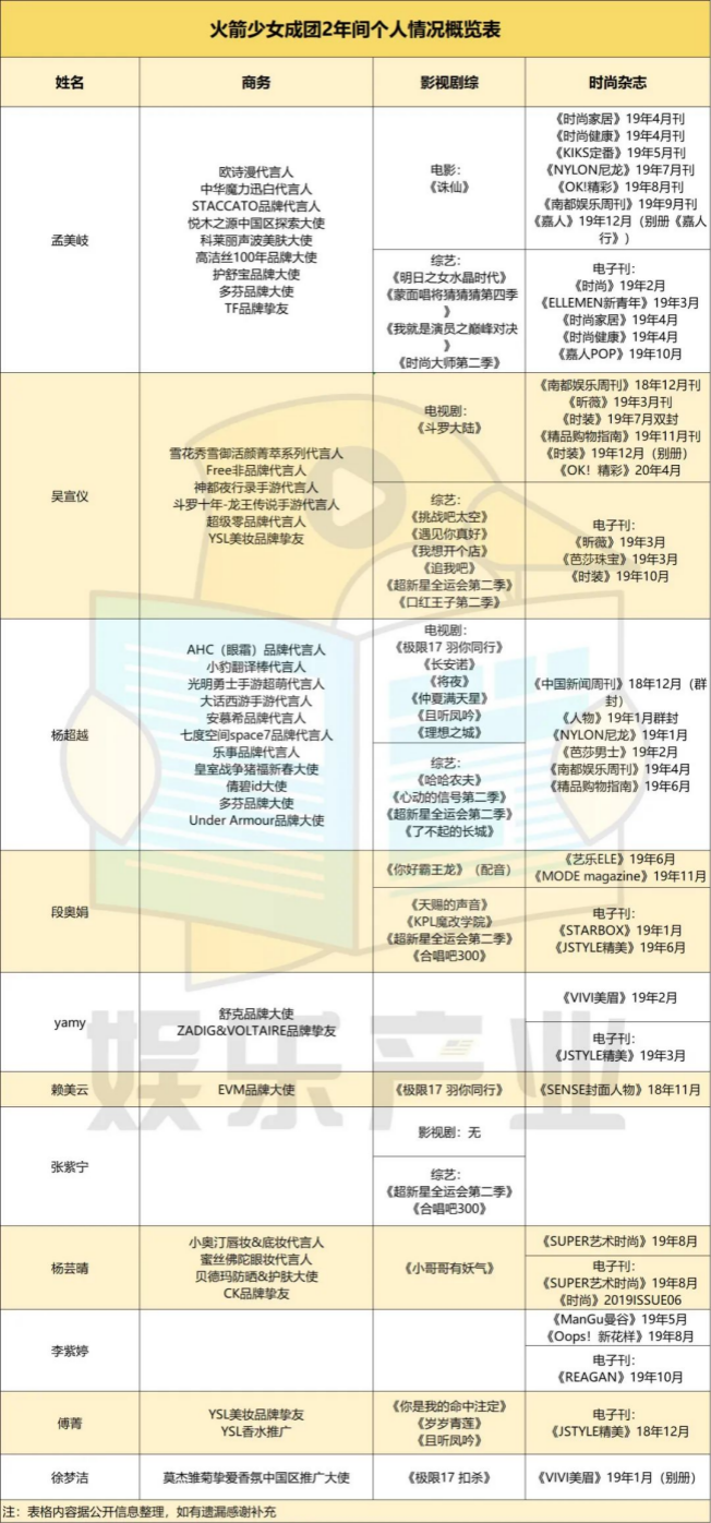 THE9这边,情况也差不太多。C位刘雨昕,严格意义上的团体商务2个,个人合作11个,小分队2个;话题中心人物虞书欣的个人商务合作4个,小分队2个,团体2个。