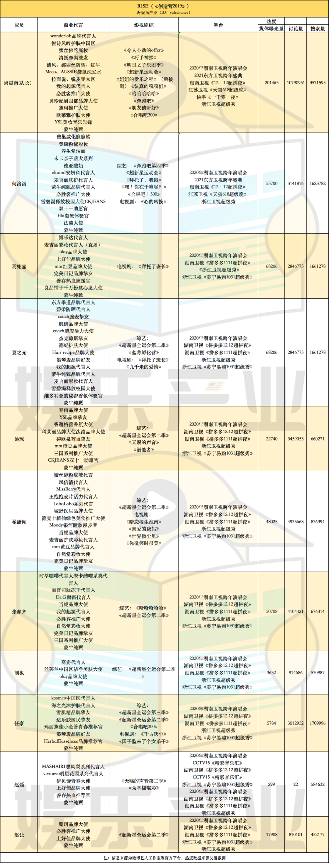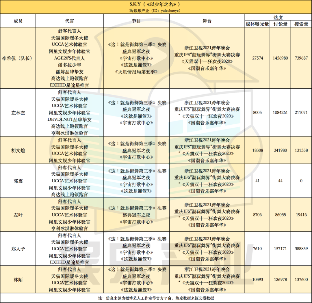 但,有意思的是,对于2020年在役四大团当中存在感最弱的SKY和硬糖少女,全员跟着团体行动,无论是商务代言还是影视剧综和舞台的情况,个人资源几乎全无。