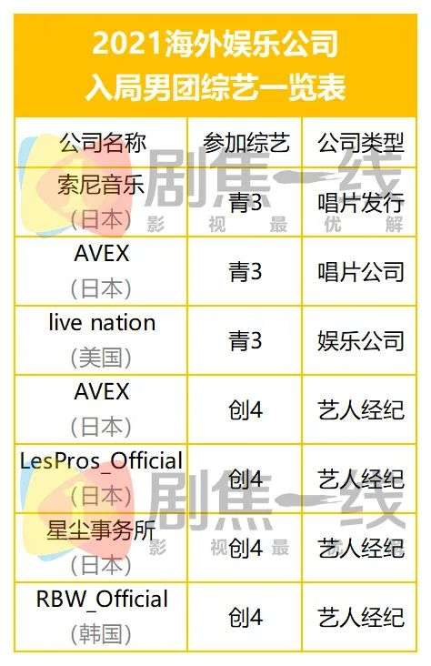 今年,共有3家日本经纪公司、1家韩国经纪公司加盟《创4》;1家日本经纪公司、1家美国经纪公司加盟《青3》。