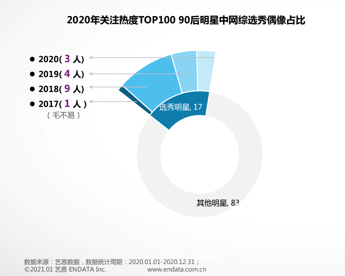 2020 年跻身热度 TOP 100 的 90 后明星中,网综选秀明星的主力还是 2018 届的前辈,而 2019、2020 届的后辈加起来还没有前辈多。