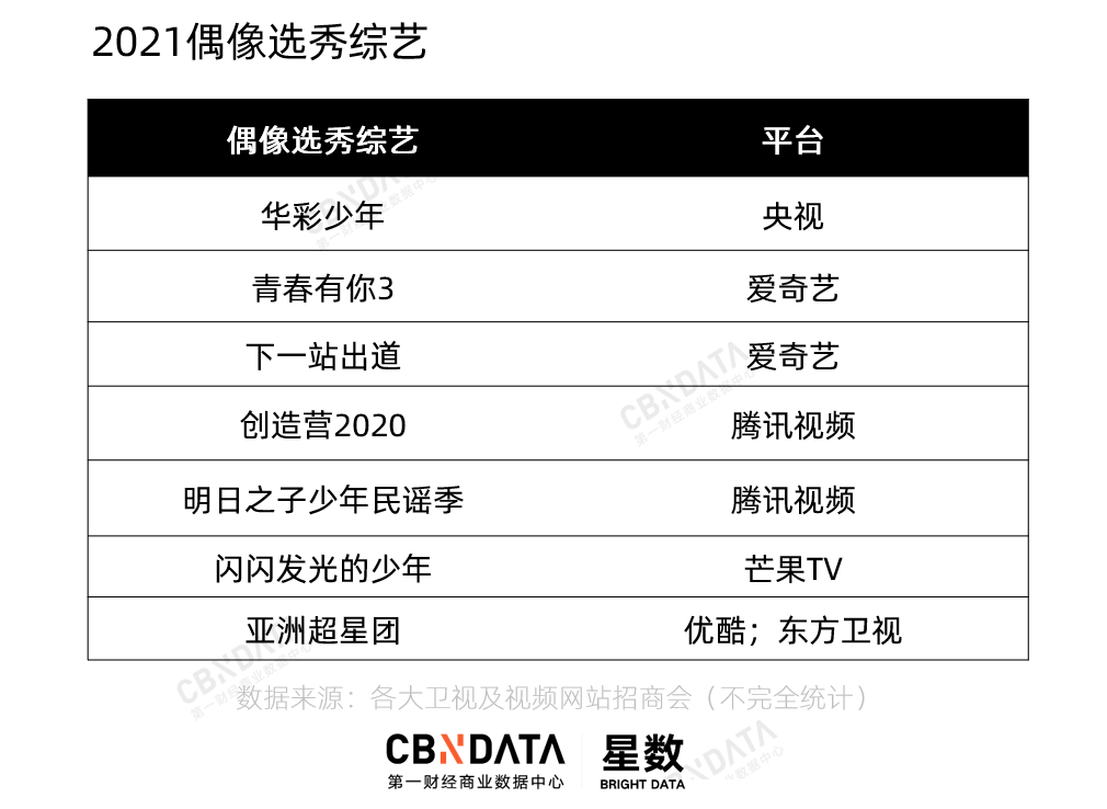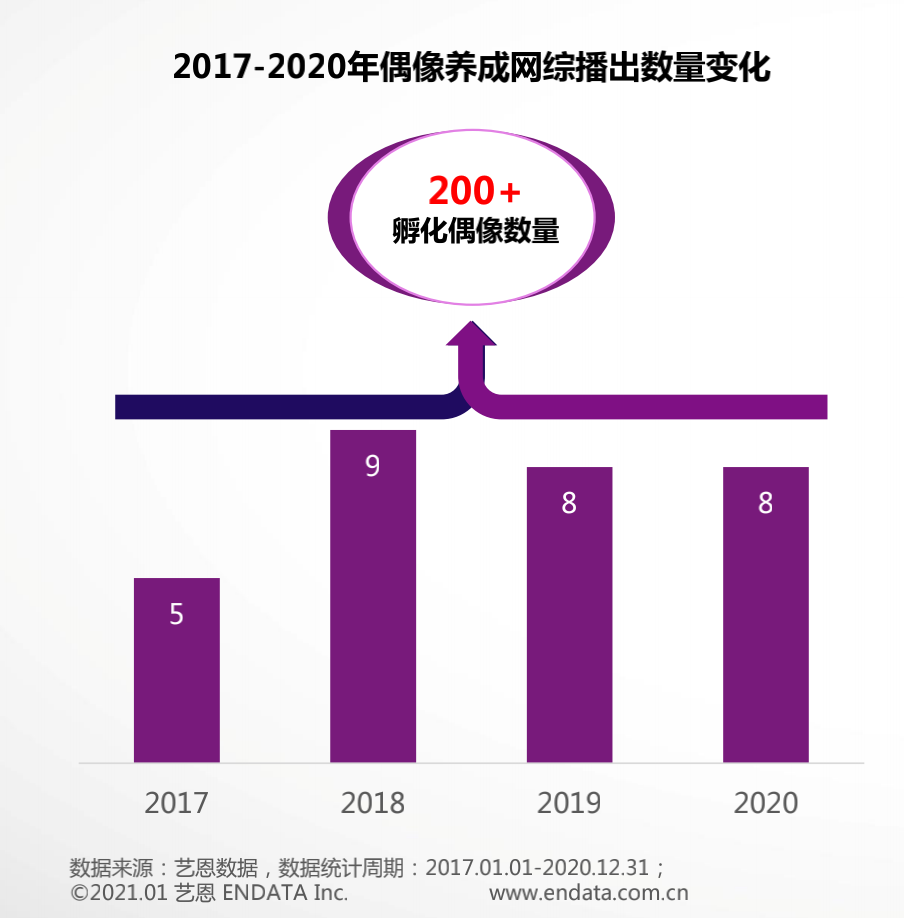 在 2017-2020 的短短四年里,爱优腾芒竞逐偶像市场红利,一共打造了 30 档偶像养成网综,为娱乐市场输送了惊人的 200 多位偶像。