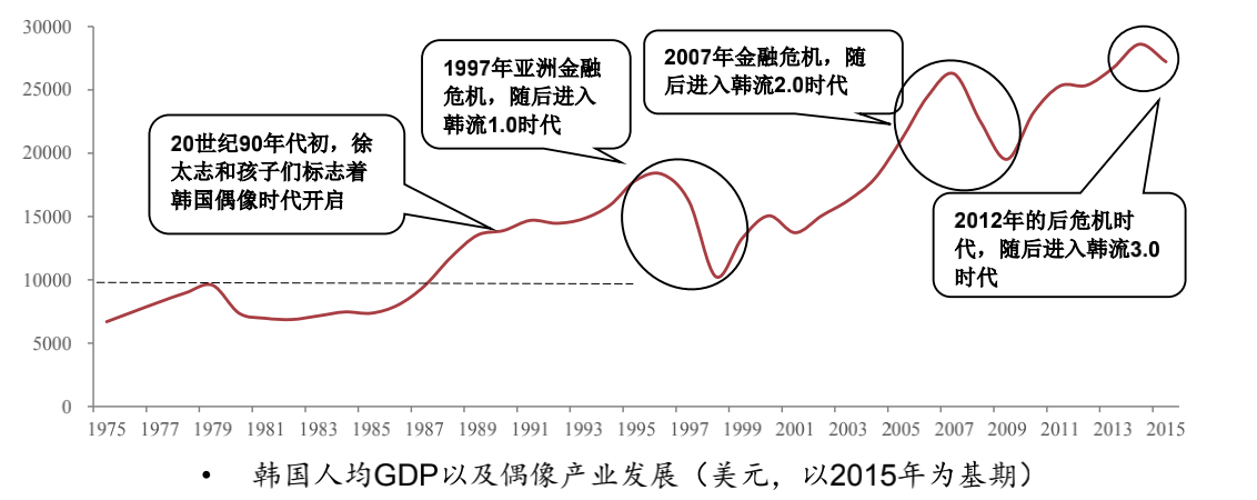 韩国偶像产业总在经济经历高速增长后出现拐点时(危机、不景气或增速下滑)迎来爆发。来源:中泰证券