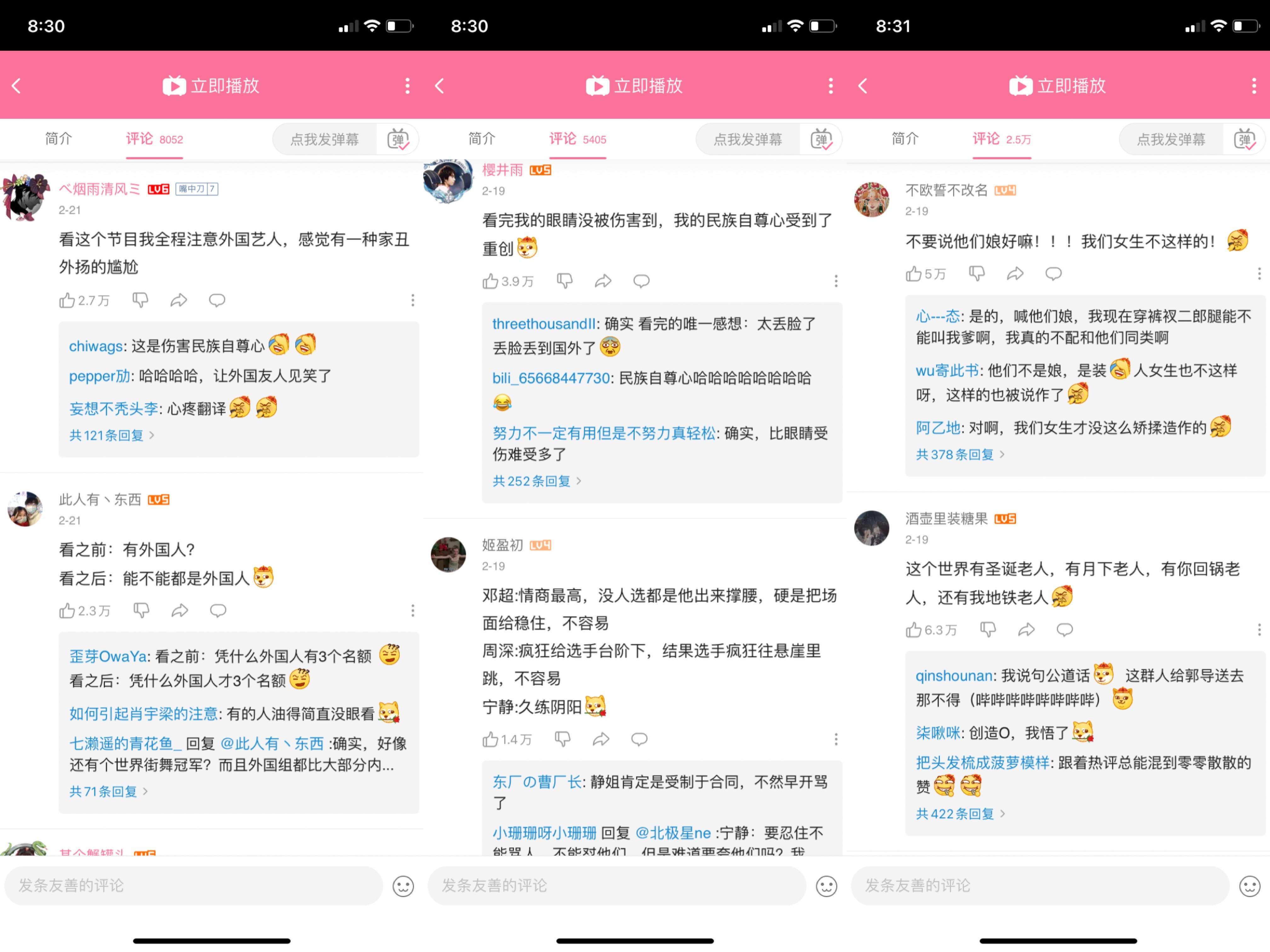 骨朵热度指数排行榜显示,2 月 24 日,上映 8 天的《创造营 2021》(以下简称《创》)单日播放量达 931 万,登顶热度榜;而《青春有你 3》(以下简称《青》)较为逊色,排名第五,不及《明侦》、《奇葩说》和《吐槽大会》。从舆论表现上来看,《创》比《青》的造梗能力更强,第一期节目中数个国内选手跑调、破音、摔倒,而海外选手发挥稳定,不乏惊艳表现,令人尴尬的对比激发了大量讨论。