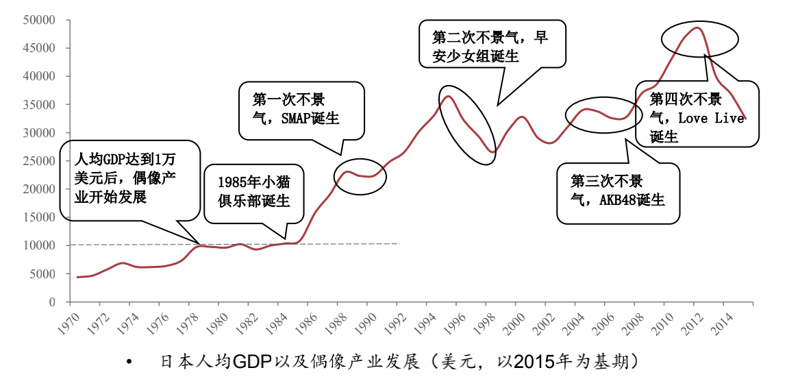 日本偶像产业总在经济经历高速增长后出现拐点时(危机、不景气或增速下滑)迎来爆发。来源:中泰证券