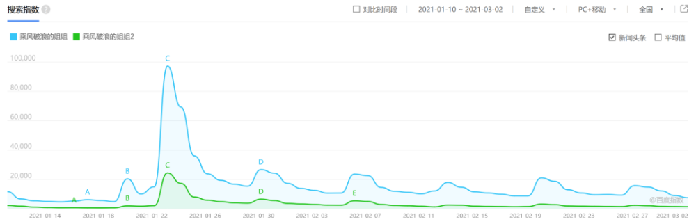 对比《浪姐1》播出期间的百度搜索指数来看,节目热度峰值一度逼近40万,且整体搜索指数在较长一段时间内都保持在10万以上,远高于《浪姐2》的整体表现。