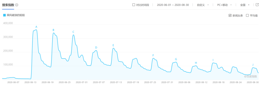 而在《浪姐2》播出期间,根据百度搜索指数,节目的热度峰值出现在首播当天,之后便经历了一个大幅度的回落,整体保持在2万-4万之间。