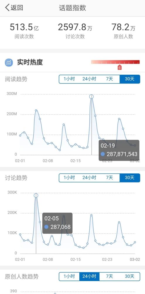 另外,在关注度和讨论度更集中的微博上,#乘风破浪的姐姐#话题阅读量已经达到513亿次以上。但是,在这之中,有450亿左右的阅读量都来自《浪姐1》的热度。最近30天内,该话题的阅读量增长尚不足30亿,而#乘风破浪的姐姐2#话题阅读量也只在23亿。