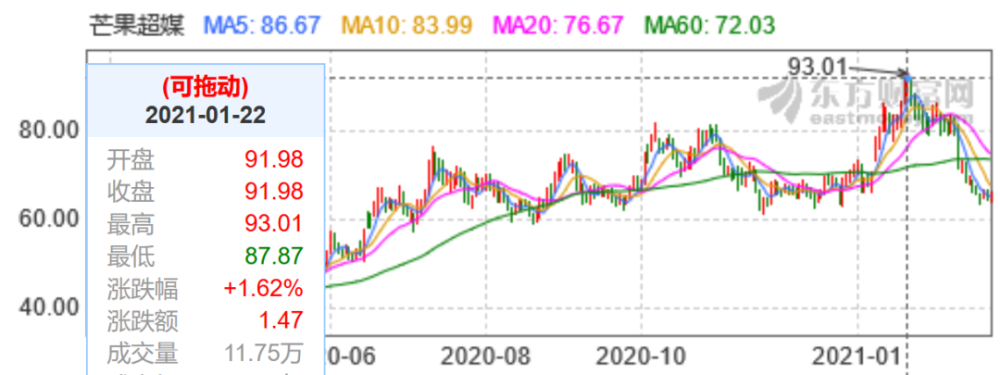 值得注意的是,这一趋势一直延续到《浪姐2》开播。1月22日,也就是《浪姐2》开播当天,芒果超媒的股价峰值达到93.01元/股。然而,也是从这一天开始,公司股价连续多日暴跌,截至今日收盘,芒果超媒的市值已蒸发480多亿。
