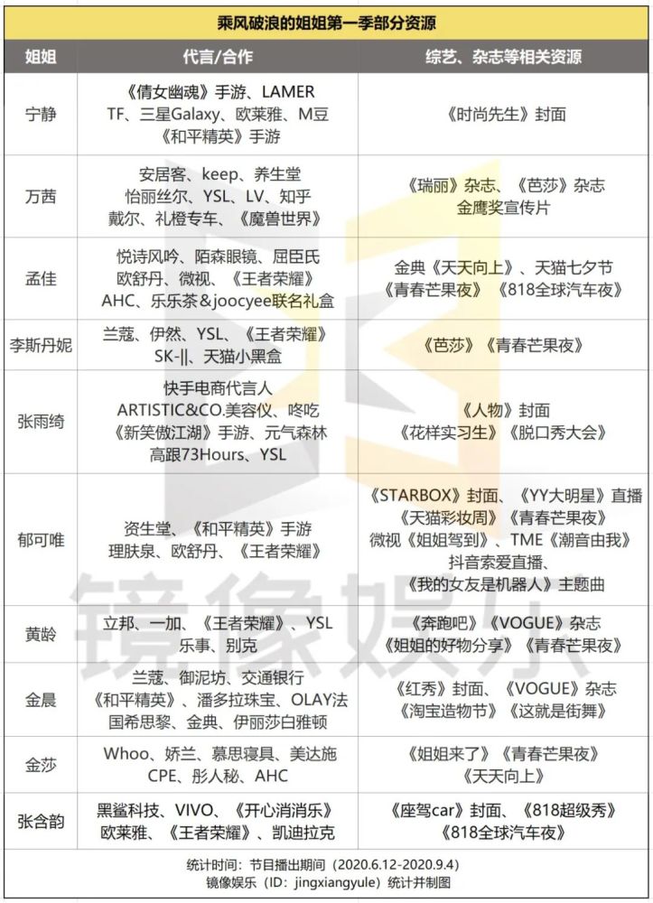 回看《浪姐1》时,除了宁静、张雨绮等这样级别的姐姐,对于大多数姐姐来说,尽管这档节目在当时的影响力尚不可知,但已是不少姐姐能拿到的不错的资源。